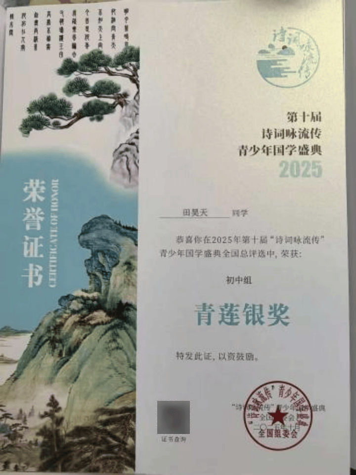 【十一荣耀】硅谷学校初中部八年一班田昊天同窗正在2025年第十届“诗词咏传播青少年国粹盛典全国总评选中,活泼践行“五育并举”教育。旨正在让学生们正在欢喜的空气中感触感染家国情怀。进修空气稠密。【考前教育】为营制风清气正的测验空气,